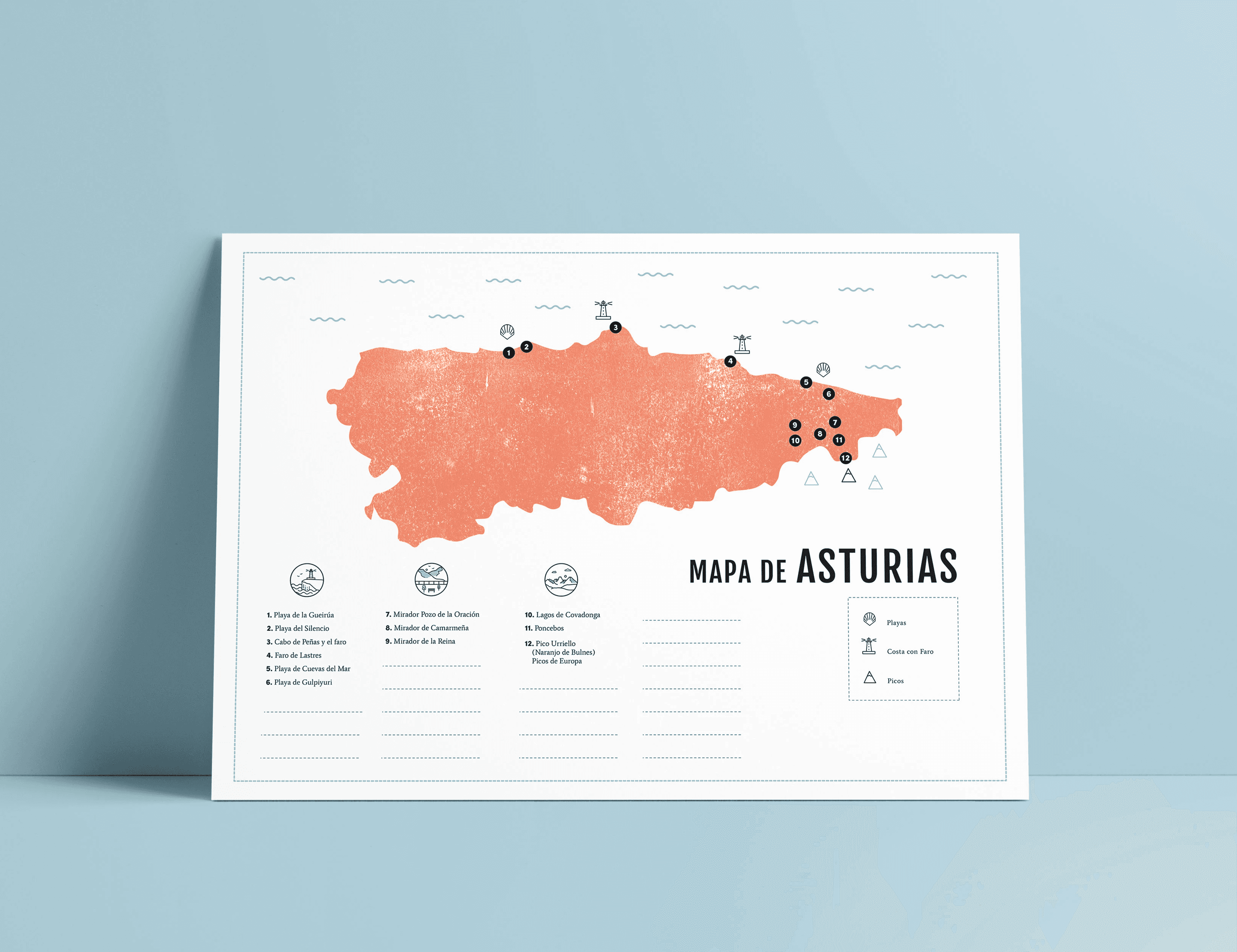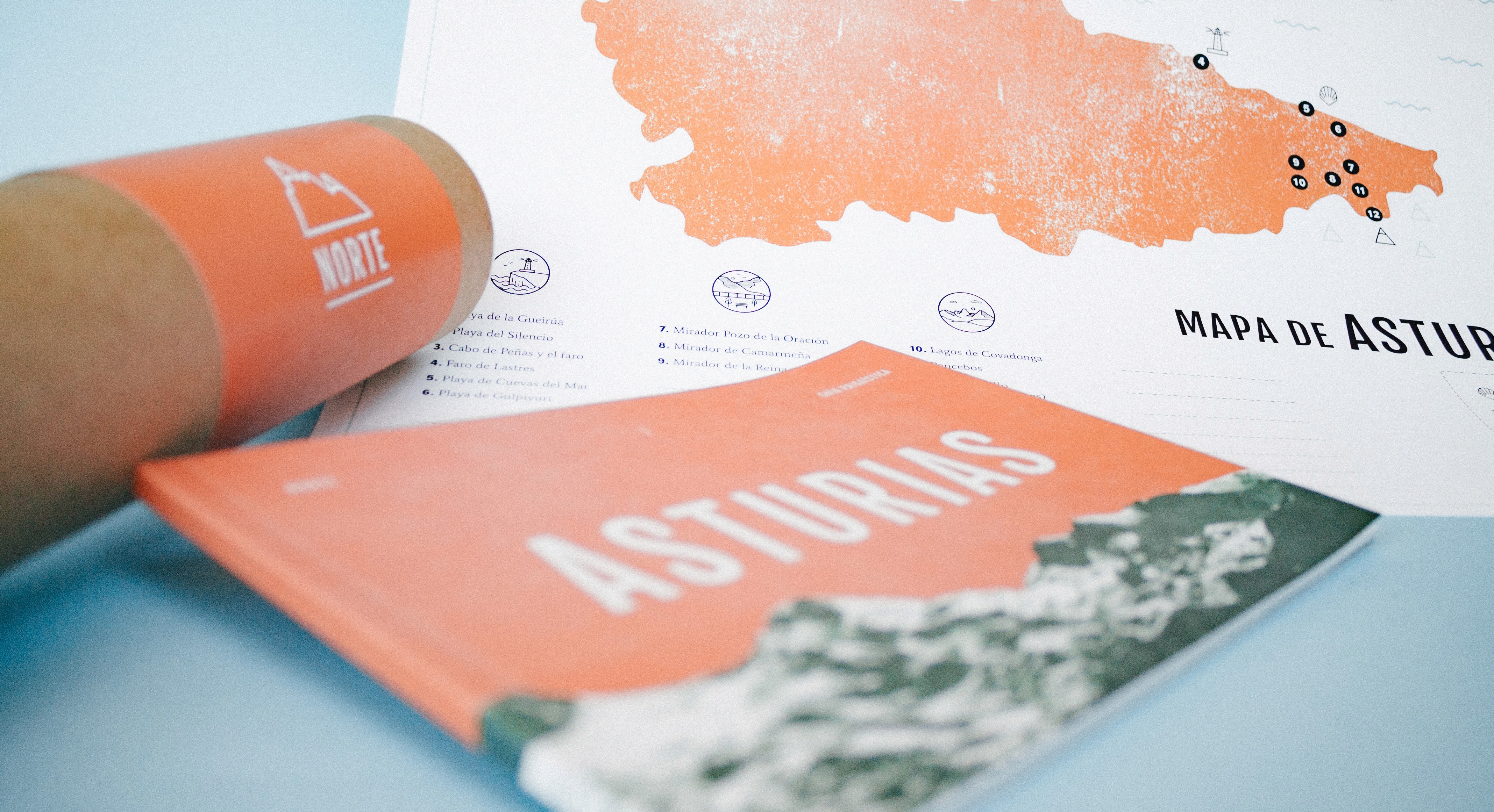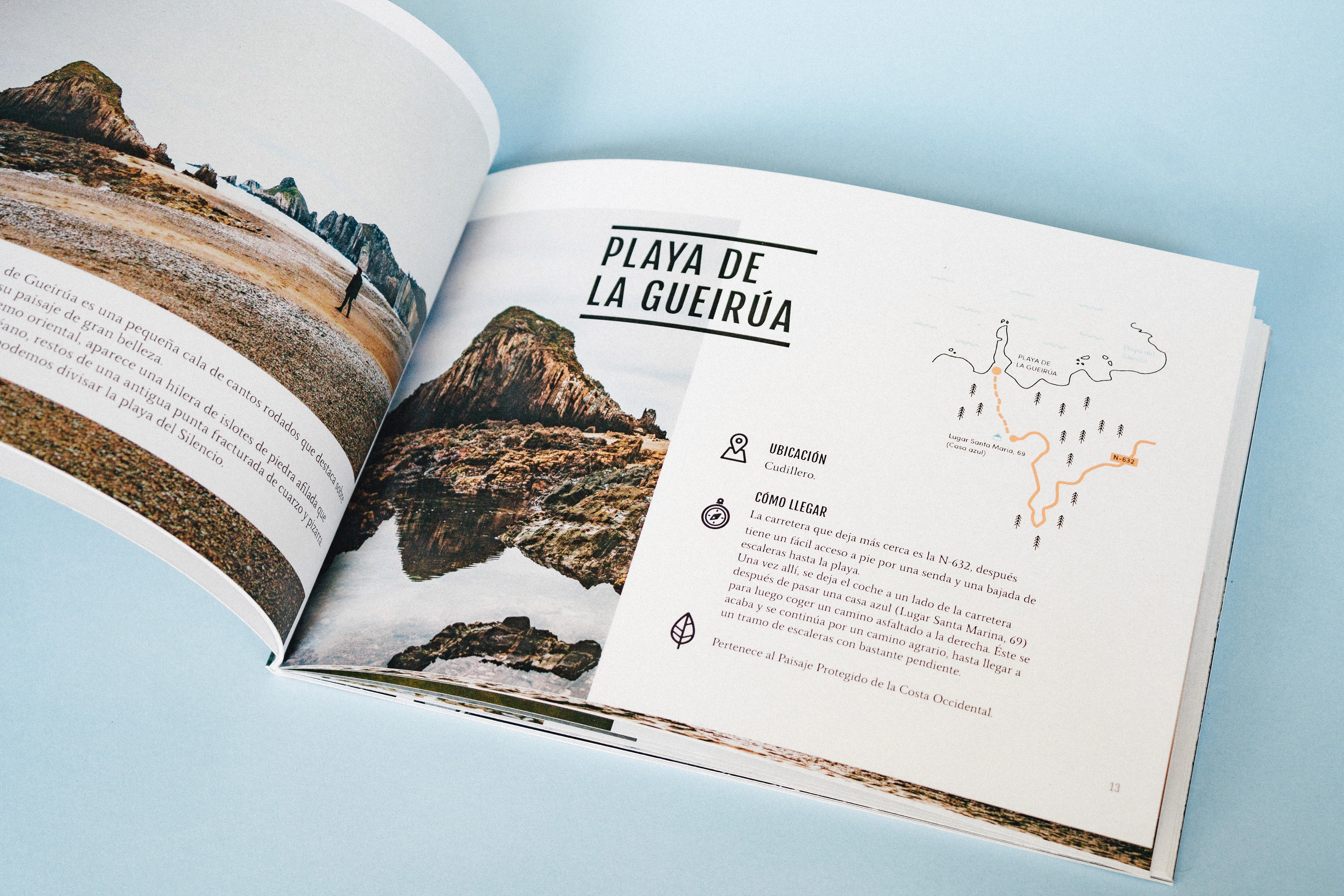 Proyecto personal que hice hace unos cuantos años, donde diseñé una guía de paisajes de las zonas del norte de España. Este prototipo fue en concreto sobre Asturias, donde diseñé los picotgramas, los mapas, realicé mis propias fotografías…