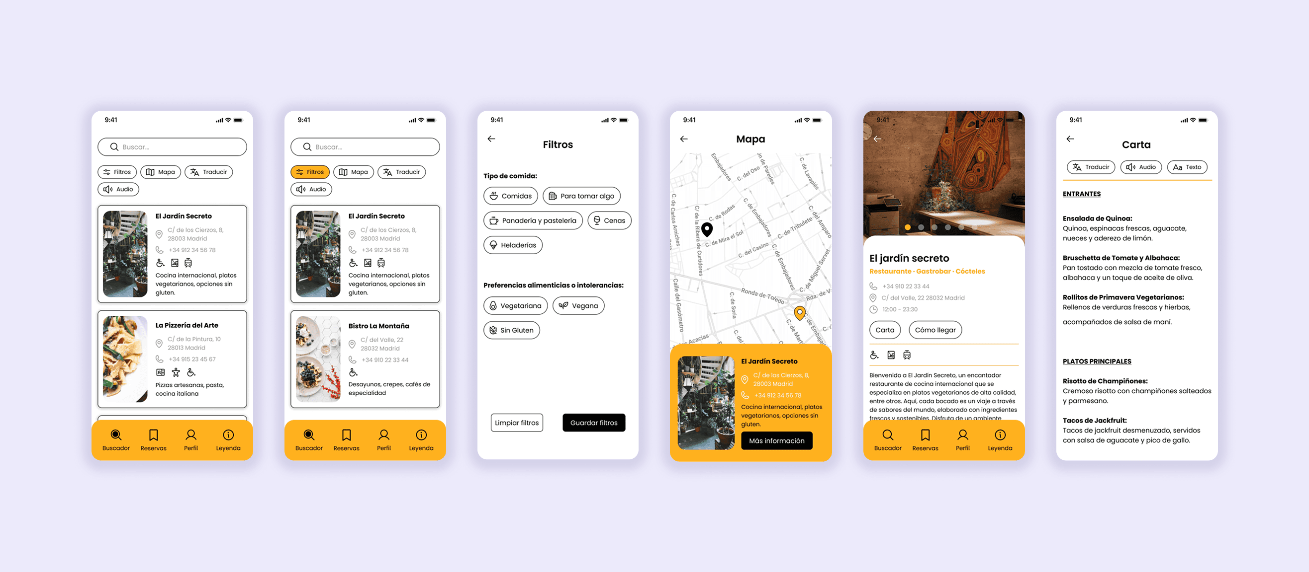 No sólo enfaticé en los usuarios con limitaciones de movimiento, igualmente implementé mis habilidades recién aprendidas para integrar las normativas AA y AAA. Aseguré altos contrastes entre el fondo, el texto y los botones. La fuente es fácilmente legible. En el menú del Restaurante se puede traducir el texto, modificarlo o escucharlo (sin prototipado). Los iconos tienen descripciones que optimizan la legibilidad y la comprensión para todos los usuarios. Valoricé el minimalismo en la app para optimizar la accesibilidad y la funcionalidad. He provisto amplios espacios para facilitar los clics en los botones y la transición entre elementos. El menú cumple con estos parámetros: iconografía simple junto a descripciones para mejorar la legibilidad, separación entre elementos para un desplazamiento fluido y una indicación clara de la situación del usuario en la pantalla.