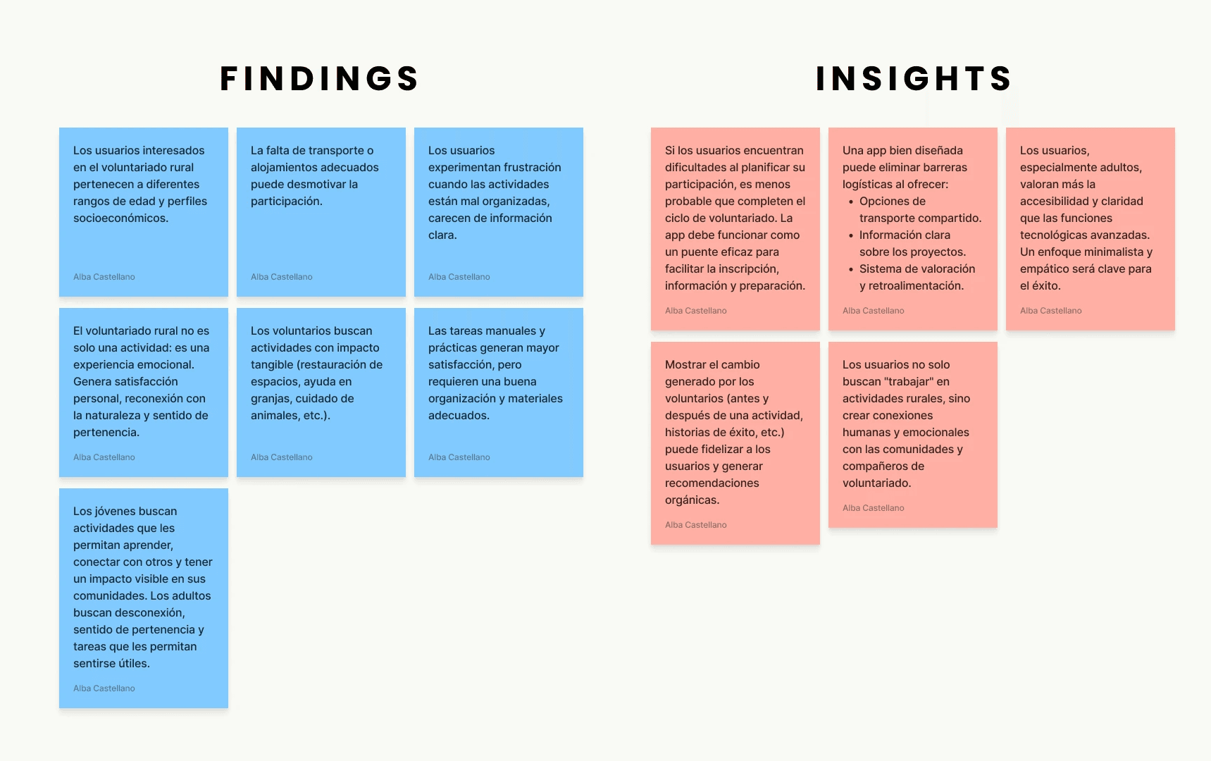 Para entender mejor las necesidades de los voluntarios y comunidades rurales, realicé un proceso de investigación combinando distintas técnicas dentro del proceso de Design Thinking, siguiendo concretamente el método Doble Diamante.
